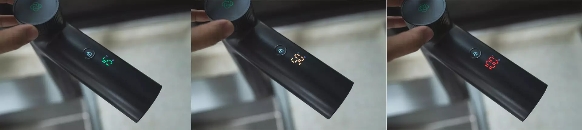 A418H龙头除了支持旋转,按键方面还支持旋转和按压。物理按压回弹清脆,厂商声称10万次寿命我也没法测试,理论上可以用到换机为止。无极旋钮操作有一定阻尼,且带有一定隔断感,盲操5℃为一格,方便实用。防误触功能并不是单纯的锁与开的关系,出水温度数显告诉我,当常温水和50~55℃(橙色字体)时即便是锁上时也可以使用,仅在热水60°以上(红色字体)时起作用。锁不是目的,防烫才是本质,不论大人小孩都一样。