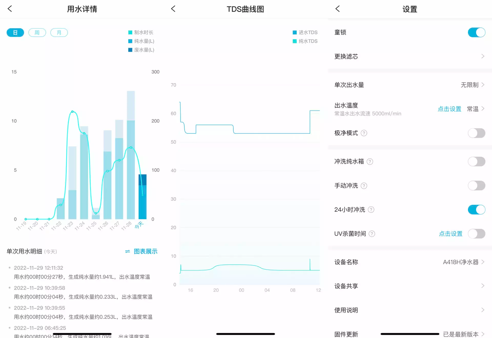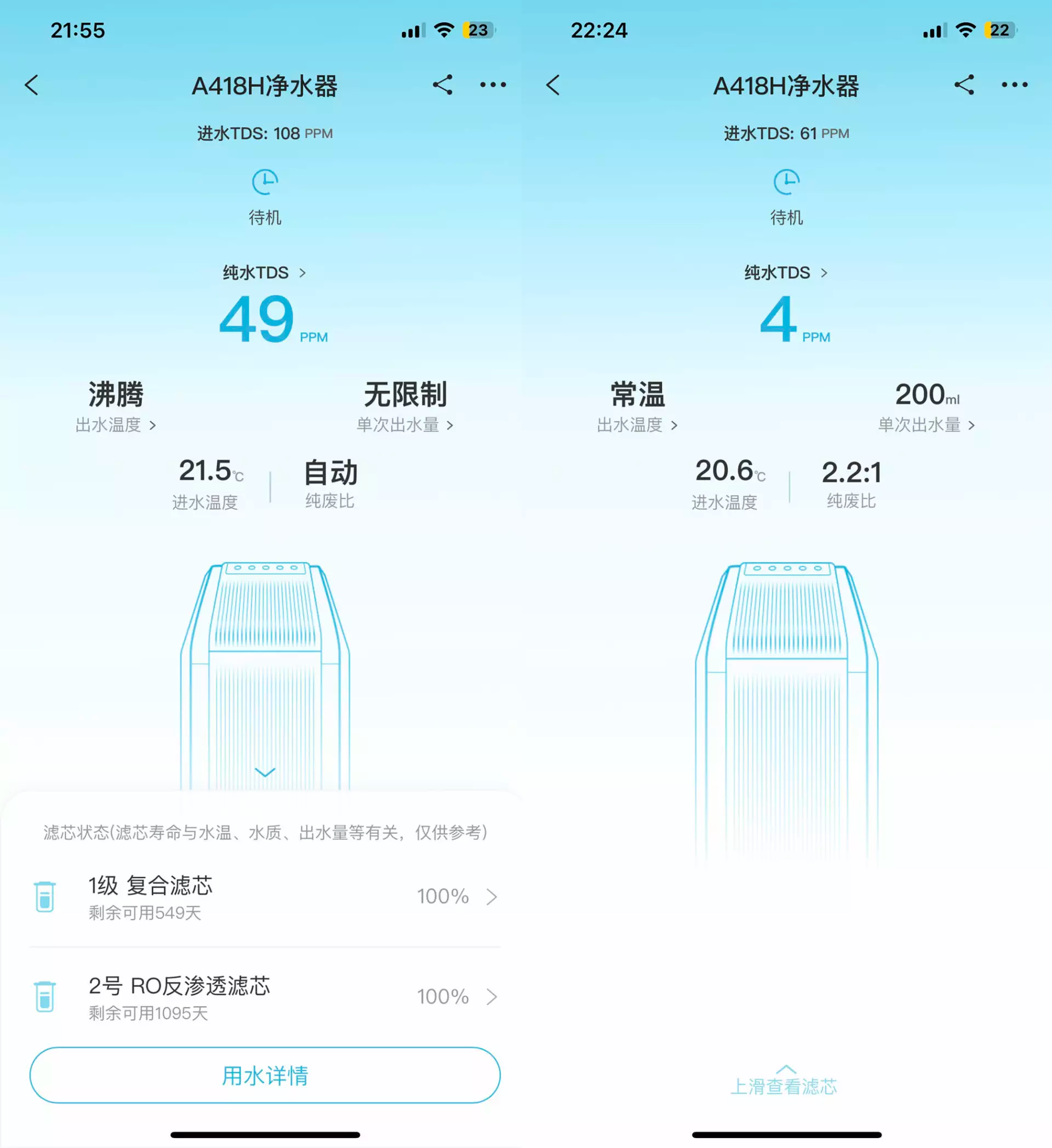 对于日常使用,废水比数据可以侧面表达不少信息。可以是进水水质、RO膜状态等发生变化,我每次进去都看到不一样。A418H技术先进,在废水压缩比例实际控制得很好,每当纯废比发生变化大概率是在机器在自清洁。在“浪费水”和“保护滤芯寿命”方面,我想谁都会优先考虑成本,那么一味纠结纯水机产生的废水量多少就没有意义了。