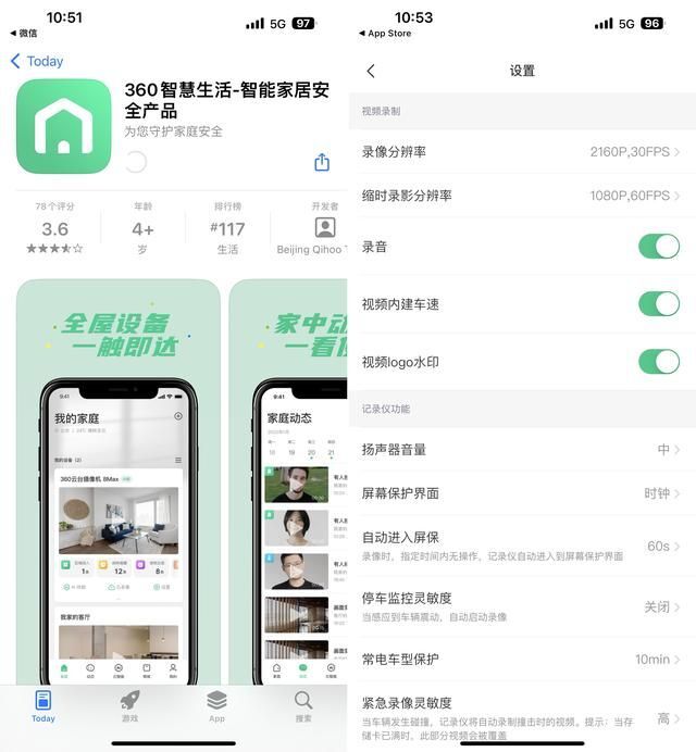 以前用过一次 360 行车记录仪,结果现在 APP 根本搜不到这个 G900 的连接,不得已看一下说明书,才知道现在又出了一个 360 智慧生活的 APP,顺利连接了。在 APP 内可以看到,这个 G900 是支持 4K30FPS 和 1080P 60FPS 的,高帧率看起来会流畅一点,后面我会测试 4K 和 1080 的区别。另外支持缩时录影其实就是延时摄影,1 分钟变 1 秒,最后合成视频,主要就是停车后开启。