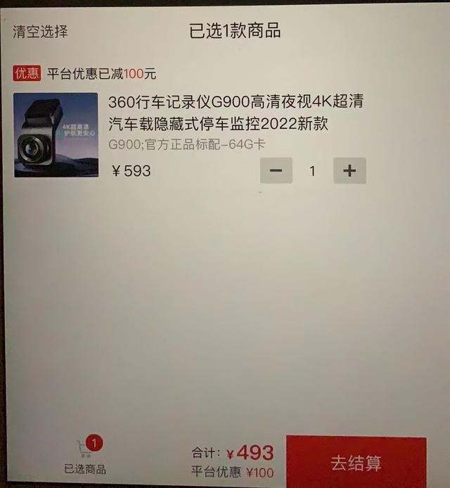 Smart 精灵#1 本身并不带行车记录仪,路上开车还是怕万一遇到紧急情况,所以需要额外选购一个,搜索了几个记录仪,经过对比,觉得刚出的新品 360 G900 好像还行,于是在 PDD 搜超级秒杀弄到了-100 的券,493 元到手,估计也是历史低价了。