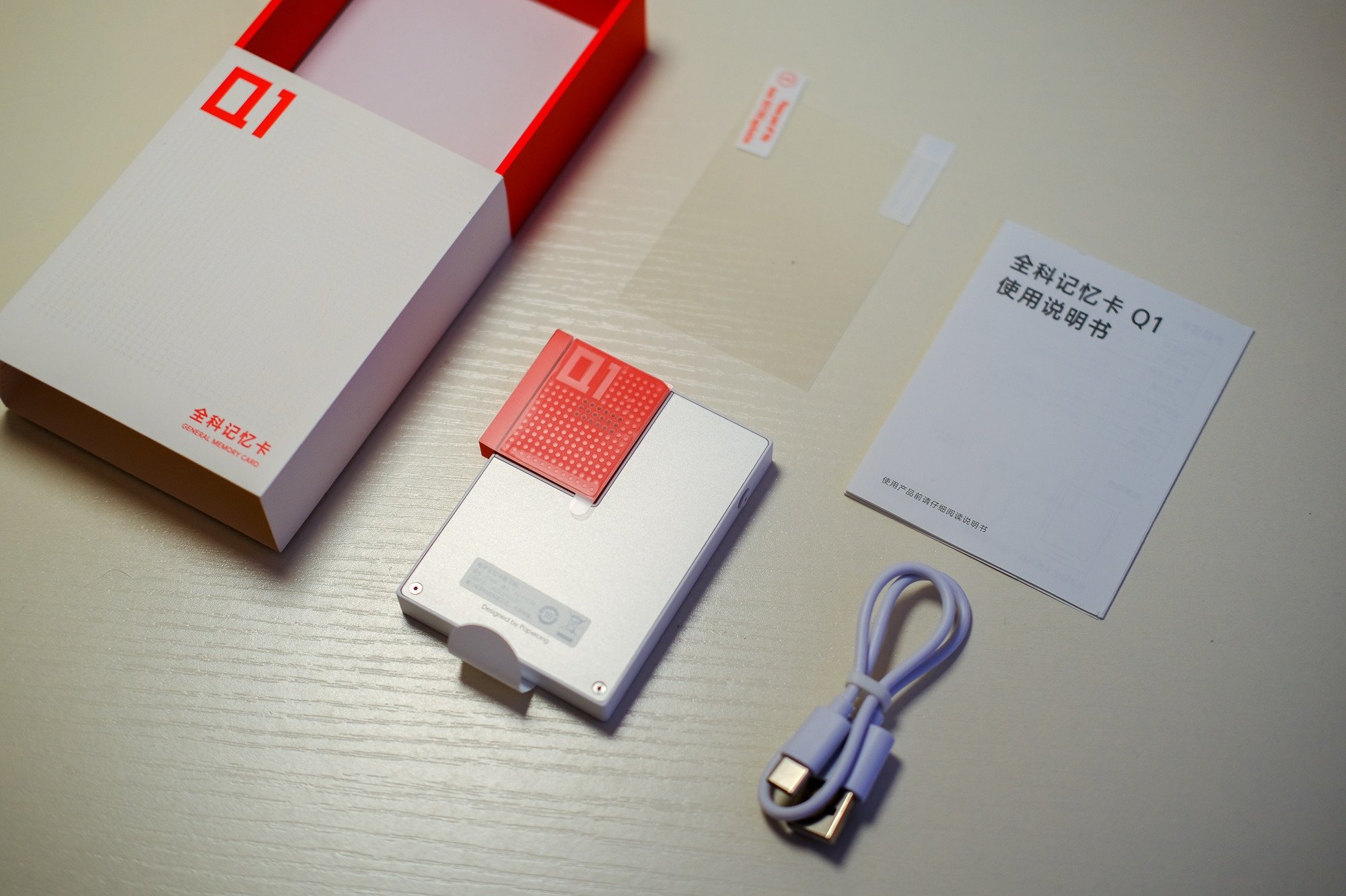 开箱老规矩,还是先来看一下包装内的附件部分。除了喵喵智能学习卡Q1之外,另有一个用于充电的Type-C数据线,一张屏幕贴膜和一份使用说明书。