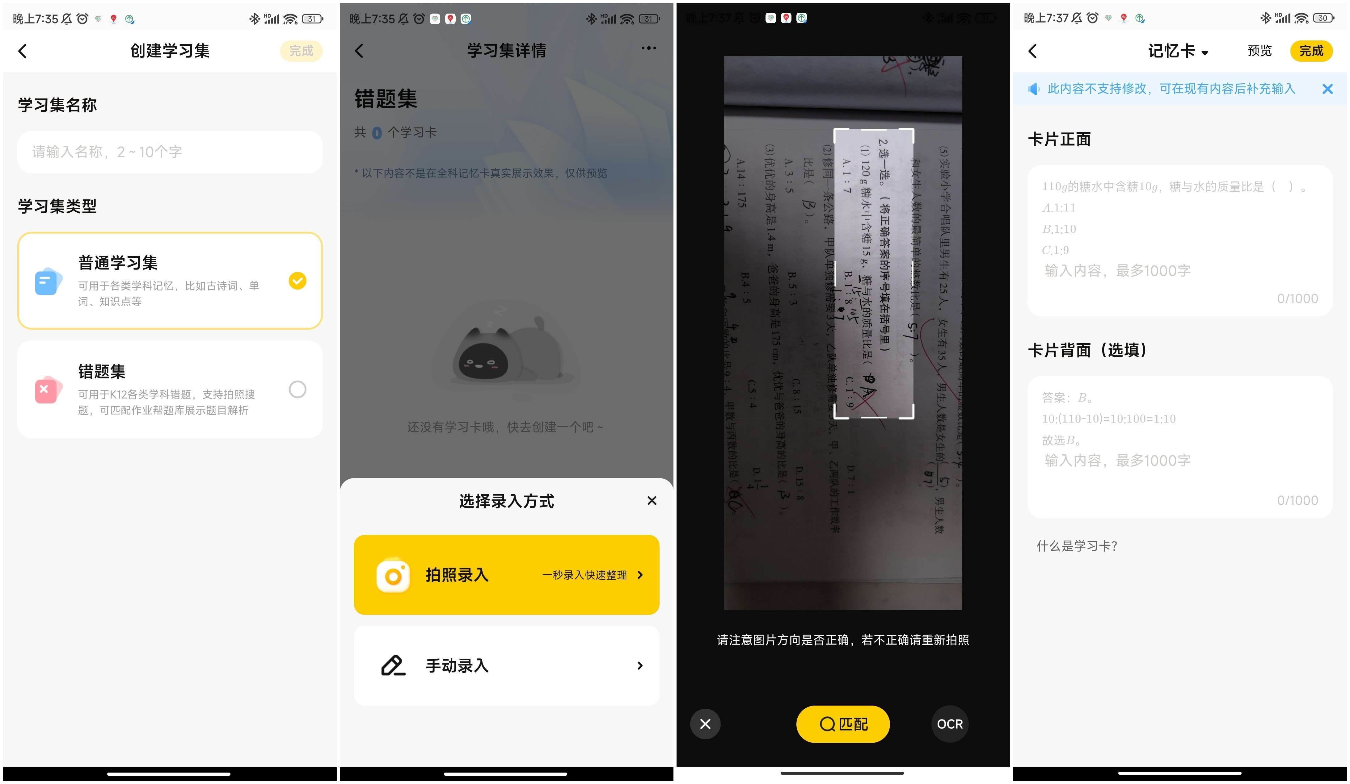 另外,喵喵智能学习卡Q1还支持创建学习集(记忆卡),可以做普通的学习集,比如古诗词、单词、知识点等等;还可以做错题集,用于巩固孩子学习的弱项。在创建错题集的时候,它支持拍搜,这里就不得不提下作业帮5.8亿+的题库和一些高频考点的加入了。扫描之后,题目和解析直接会生成为记忆卡的正背面,是不是很方便?