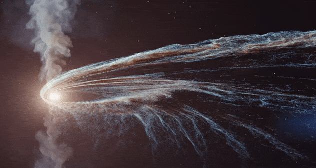 于是这颗恒星被黑洞的巨大潮汐力撕碎,原理相同的事也在地球上发生,但月球对地球的潮汐力小得多,只能使地球产生潮汐现象。科学家指出这颗恒星的残骸约一半被猛地抛入了太空,而另一半在黑洞的周围积聚成了一个旋转吸积盘。随着这颗破碎恒星的物质落入吸积盘,吸积盘变得更热,也变得足够明亮,使天文学家能够在地球上观测到它的光芒。