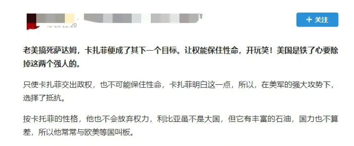 而没过去几年,卡扎菲这人,却又被很多人给当成了反美斗士、反美战友之类的,将利比亚吹成强国,卡扎菲吹成强人,当年的新闻,属于是一点都没看过。