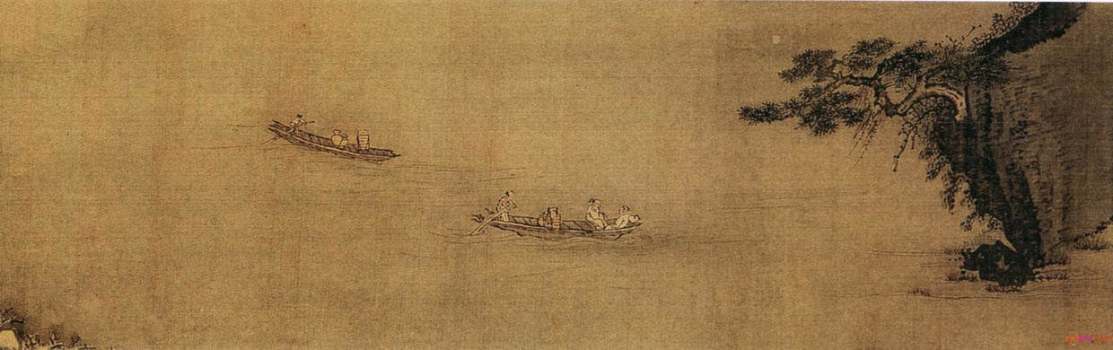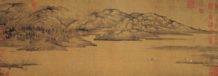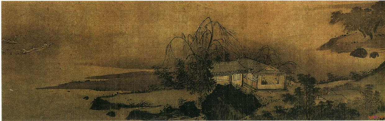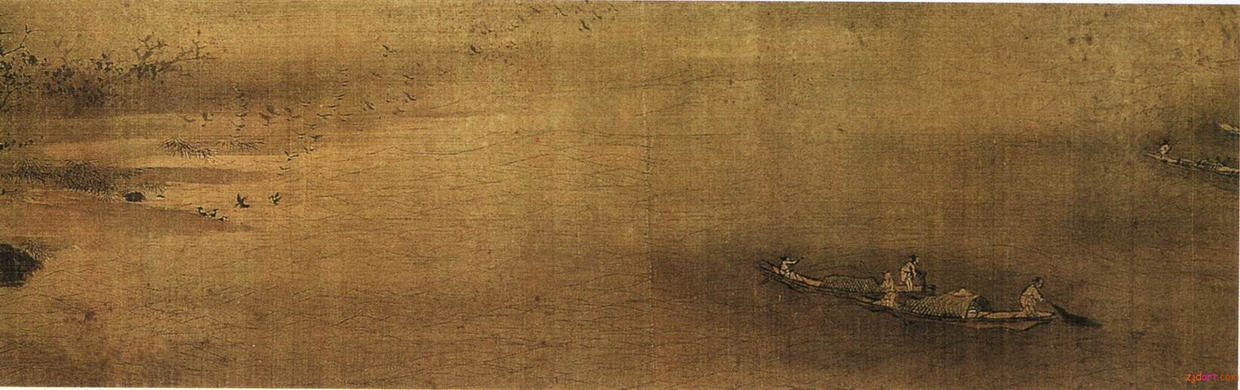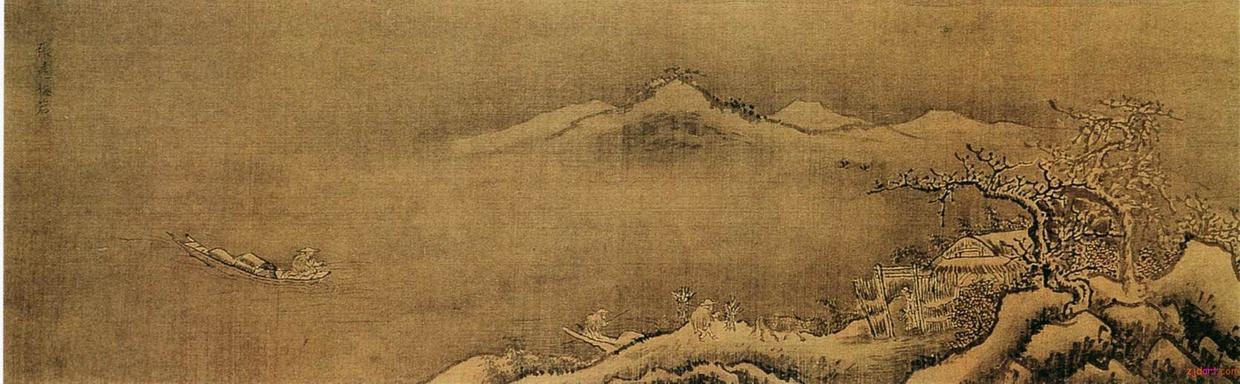 赵干的画是董源一系嫡传,亦是一片南方景致。他的《江行初雪图》卷,布置既具有平远的特色,但又不同于董源整体构图,上天下地,层层舒展。其取景不求于平远浩瀚的江流水色,而是选取江中近、中之景,表现江景的曲折变化和人物、舟楫的活动。这种布景方式别具特色,景物范围虽然局限于一条狭窄的江面、坡岸,但人物以活动、地貌变化、江流港汊的前后交错伸展皆协调、自然,宛如从阔大的自然画图上截取了一角,而观者所领略的诗情画意溢于卷外。