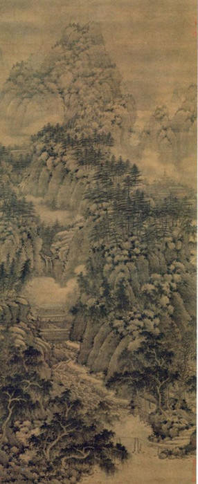 巨然、刘道士的山水画,在布置取势上是以立轴的构图方式,表现南方深山的云壑幽居,具有北方派的奇峭之势,如《湖山清晓图》、《秋山问道图》、《山居图》、《万壑松风图》、《层岩丛树图》等,但他绝无北方派的刚健、老硬和刻露.通体看,巨然、刘道士山水画仍是笔墨柔和,骨肉兼得,土石相间,其山石绝无突出的主干线,而是用长短披麻皴山体,用苔点和晕染来突出山体的轮廓及前后层次,特别善用淡淡的水墨烘染山间的云气和山体,让天地、云山笼罩与柔和明润的境界里,正如沈括所说的“淡墨轻岚”。