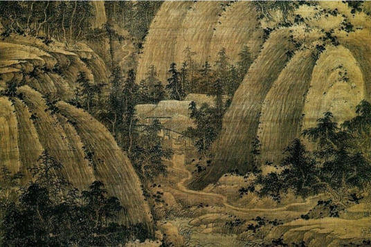 巨然与刘道士对董源温润柔和的风格又有所发展。我们看巨然的《秋山问道图》,山用淡墨长披麻皴,层层深厚,不为奇峭,仍是董源本色。山头折塔转换处,叠以卵石,皆用水墨烘晕,不施皴,多空白,而苔点飞落,遂使整座大山气势空灵,生机流荡。特别是综合皴、点、染以组织山石,强调明暗,取得气势以及对于笔与墨的有机融合上,似比董源更为成熟。巨然、刘道士作画气势奇绝,而笔墨匀停、柔和。米芾说:“苏沁家有巨然山水,平淡奇绝。”(《画史》)巨然能将北方派的山势与南方派的笔墨融为一体,难能可贵。