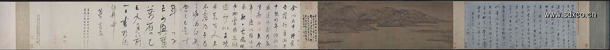 董源的山水画,平远幽深,一片南方,这种布景手法,对其先辈李思训、荆浩等唐代山水画来说是一大变革,它使画家有更大的自由去表现展示在画家眼前的千里江山。董源的《夏山图》卷就是代表这种构图、布景方法和风格特色的典型杰作。该图画的是一片冈峦重叠、烟树沙碛景致,在其间点缀了一二人物,桥、亭,及牛羊牧放的生活场面.一眼望去画面给人以气势辽阔、平远的感觉。董源把极其单调平常的平沙渚堤和叠冈远峦作为描写的主题,并展开成3米多长的巨幅,这在董源以前是少有的,不能说不是董源在山水画构图、布景上的一个伟大的创举!更难得的是,这幅画的结构十分严密紧凑,绝无松垮之感。此图的下部分利用山坡丛树的一起一伏,顶部以远山覆盖于冈峦之上,时隐时现。这样的章法本身,组成了既有规律又有变化的节奏和韵律,使中部一带的沙碛、冈峦间的空间,在视觉上造成一种辽阔的气势和平远的感觉,这是何等扣人心弦的手笔。树木虽矮小,但因沙碛的空间感而见其高大;冈峦虽重叠,却因远山的牵引而不感其阻隔。在艺术手法上值得重视的,是董源成功地用无数平直横亘的沙堤,来引带一座座球形叠成的冈峦,在平行横线和半球形的组合中,利用垂直的短小树干穿插其间,使它们互相关联起来,因此造成画面布景极繁密而且单纯,似平淡而有变化的不同凡响。