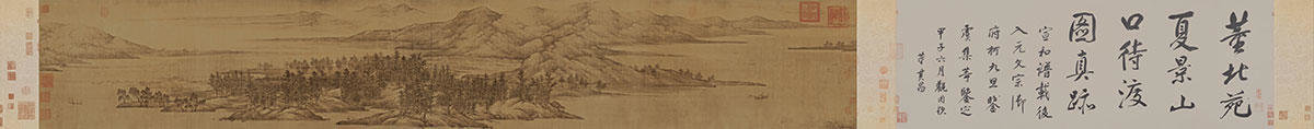 董源的作品,这种平淡天真的艺术特征尤为鲜明。展开画卷,例如《潇湘图》卷、《夏山图》卷、《夏景山口待渡图》卷等作品,云峦苍林,山远水阔,渔浦人家……让人感受到画境之悠远平淡,真情流露,不禁思绪万千。正如《宣和画谱》所云:“至其出自胸臆,写山水江湖、风雨溪谷,峰峦晦明、林霏烟云,与夫千岩万壑、重汀绝岸,使览者得之,真若寓目于其处也。而足以助骚客词人之吟思,则有不可形容者。”正因为董源的山水画富有平淡天真的艺术特征,才能牵动骚客词人的思绪,而吟思抒怀。元代画家吴镇看了董源的《夏山深远图》有感而发,题诗云:
