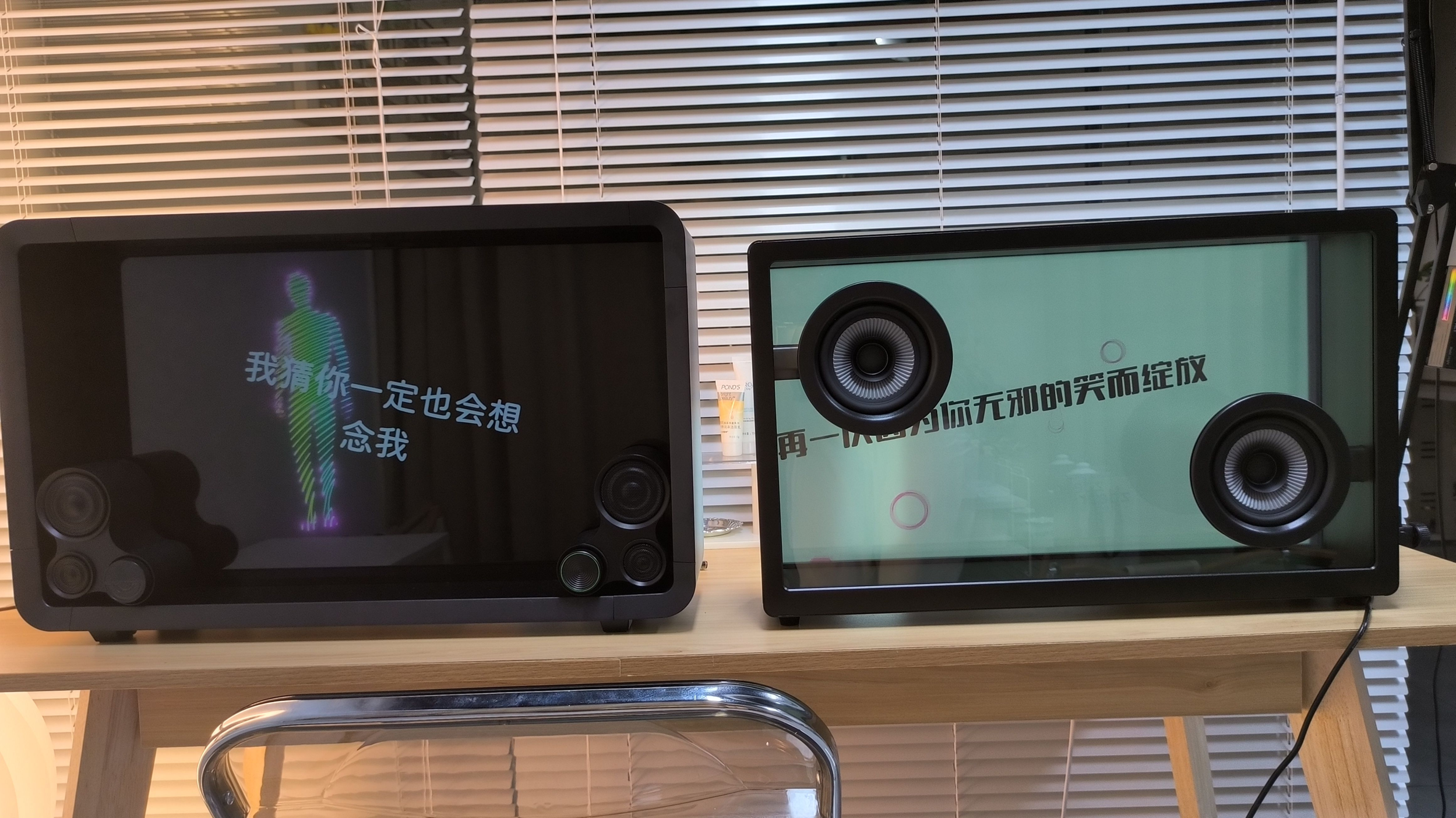 几个人把音箱前后左右都看了一圈,最后放着比较了两个音响的背部屏幕的显示效果,这款Lyiew理由投屏歌词音响背后logo的美观度细节设计更加俏皮具有科技感,相反左边的MorrorArt的纯白设计更像是一个未完成设计的工艺品,这也就意味着必须背靠墙来掩饰这个缺点了。