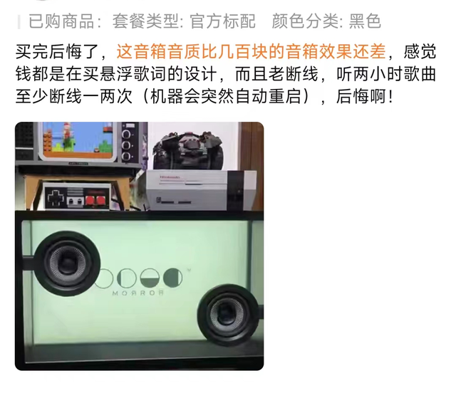 首先把外包装拆开后,悬浮歌词音箱让我印象最深的就是它的颜值,但是右边这款Morror Art的这款音响两个喇叭有点遮挡歌词了;这点对于我这种完美主义者来说掉分!