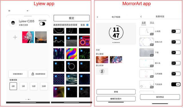 再来说下使用体验,两个悬浮歌词音箱在听歌时都可以将歌词以动态的形式展现出来,但是左边的Lyiew歌词音箱音箱会智能的根据歌曲改变屏幕背景,让原本只能拿来听的音乐也变成是一种视觉体验。这里MORROR ART悬浮歌词音箱的显示效果就显得单一许多;虽然两个都有强大的APP;也都可以支持根据上传自己喜欢的照片做北京轮播但是谁又能拒绝Lyiew这种系统更加智能化切换呢。