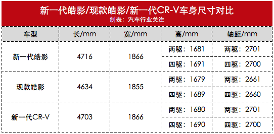 车身尺寸是新车变化较大的地方,新车对车身数据进行加长并提供7座版车型选择,其中1.5T两驱车型长宽高分别为4716/1866/1681mm,轴距为2701mm;1.5T四驱版车型长宽高分别为4716/1866/1691mm,轴距为2700mm。作为对比,现款皓影长宽高分别为4634/1855/1679(1689)mm,轴距为2661(2660)mm;新一代CR-V长宽高分别为4703/1866/1680(1690)mm,轴距为2701(2700)mm。