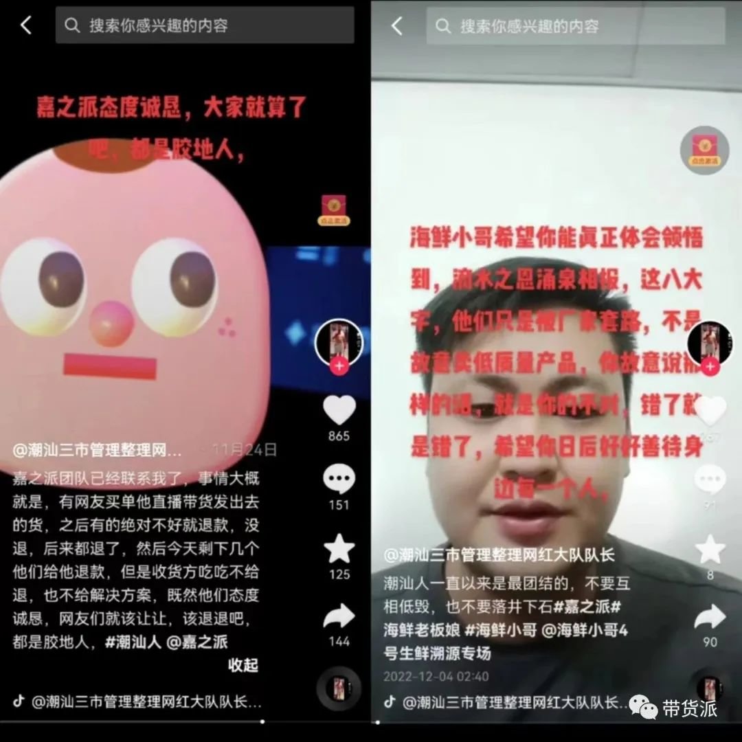 就连此前参与消费者曝光嘉之派的相关博主“潮汕三市管理整理网红大队队长”,亦话锋一转责怪海鲜小哥,称嘉之派“只是被厂家套路,不是故意卖低质量产品”,让海鲜小哥体会滴水之恩涌泉相报八字,颇为让人不解。