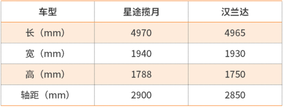 作为奶爸车,星途揽月和汉兰达自然少不了“空间大”这个标签,用最直观的数据来对比,汉兰达的尺寸是4965/1930/1750mm,轴距2850mm,星途揽月则是4970/1940/1788mm,轴距2900mm。即使是升级后的汉兰达,依旧比揽月逊色一筹。