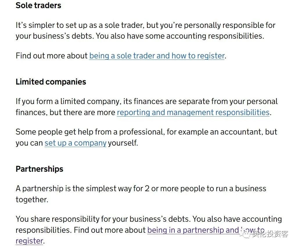 根据政府官网,英国的注册公司主要有三种类型——独资经营(Sole Trader)、合伙企业(Partnership)和有限公司(Limited Company)。