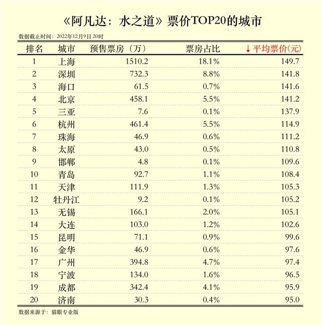 “猫眼专业版”显示,国内有14个城市《阿凡达2》的平均票价都超过了百元