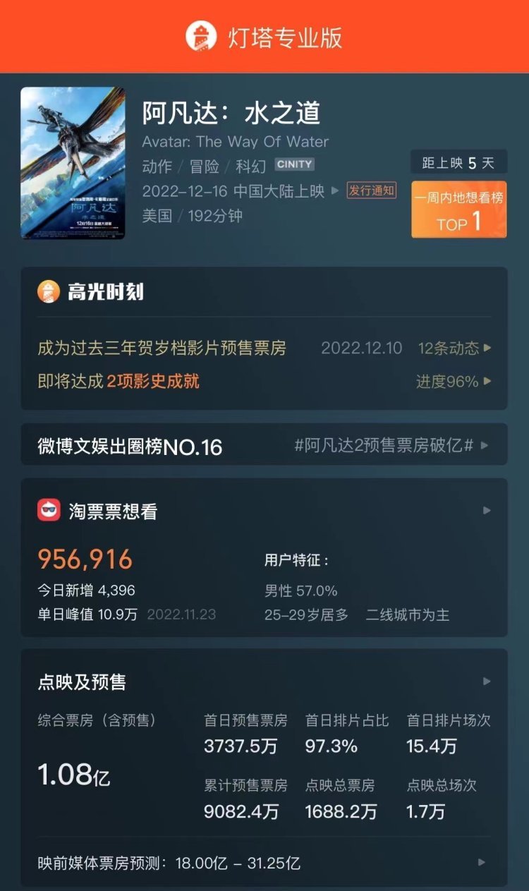 截至12月11日中午,“灯塔专业版”显示《阿凡达:水之道》的预售票房已超过了1.08亿元