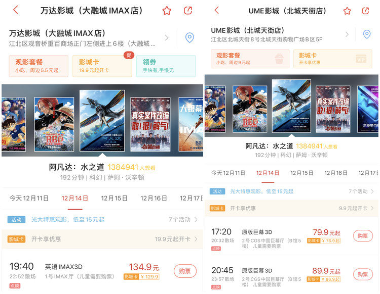 “其实不光是《阿凡达2》,应该是影院迎来复苏后,电影票价普遍都会偏高。”12月11日,国内某电影公司驻重庆负责发行的肖女士告诉上游新闻记者,大家不妨回忆2019年看电影,可以选择的影院、片种数量都多,市场活跃,各类优惠自然也多,“综合下来,票价就能做到比较低。”
