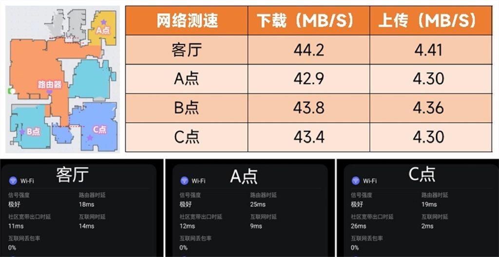 可惜我家只是实测400M的电信小水管,实属严重浪费了AX10000这么拉轰的硬件配置。初次连通网线,感知最明显就是打开网页的速度有一丢丢提升,更流畅顺滑了,不严谨地说大概快半秒的样子。实测三个位置的上传/下载速度,即使5G WIFI穿墙也影响不大,延时表现也可以(中小户型)