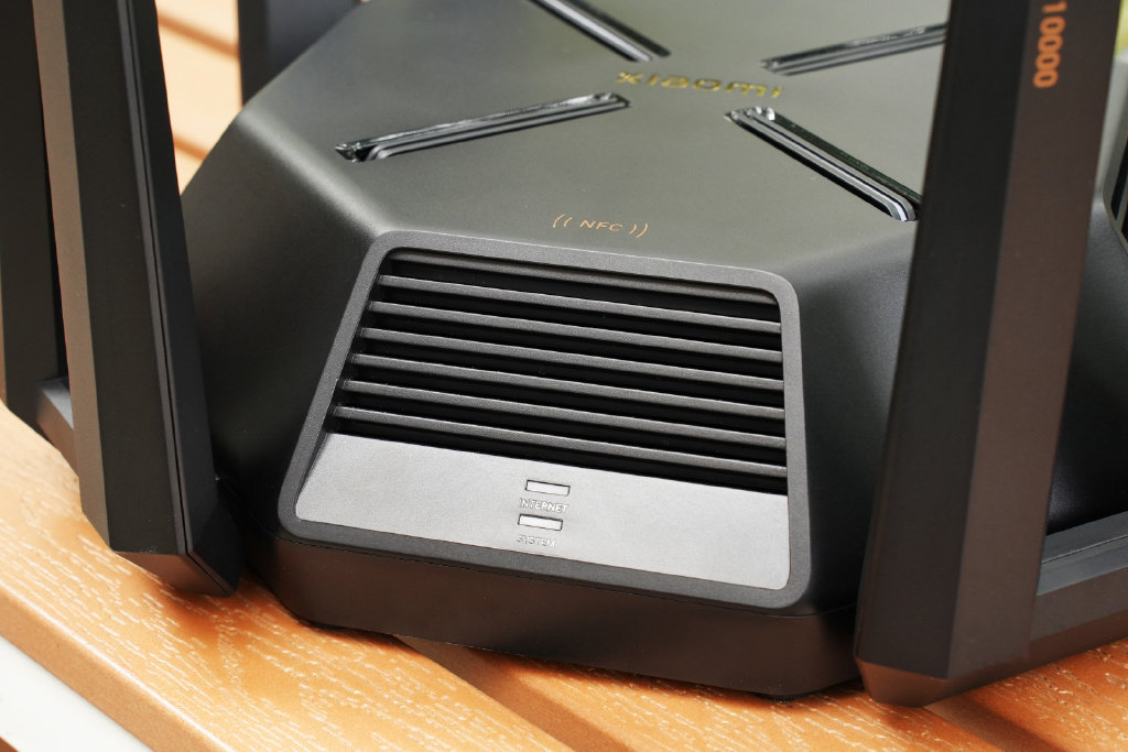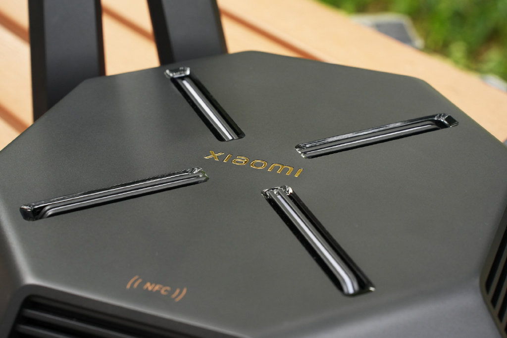 与AX9000的主要区别在于顶部LOGO改为xiaomi,还增加了NFC标识,也就是说带NFC功能的安卓手机轻轻一碰即可免密入网,屁股的接口位置也有调整,电源适配器从12V4A提升到12V5A。