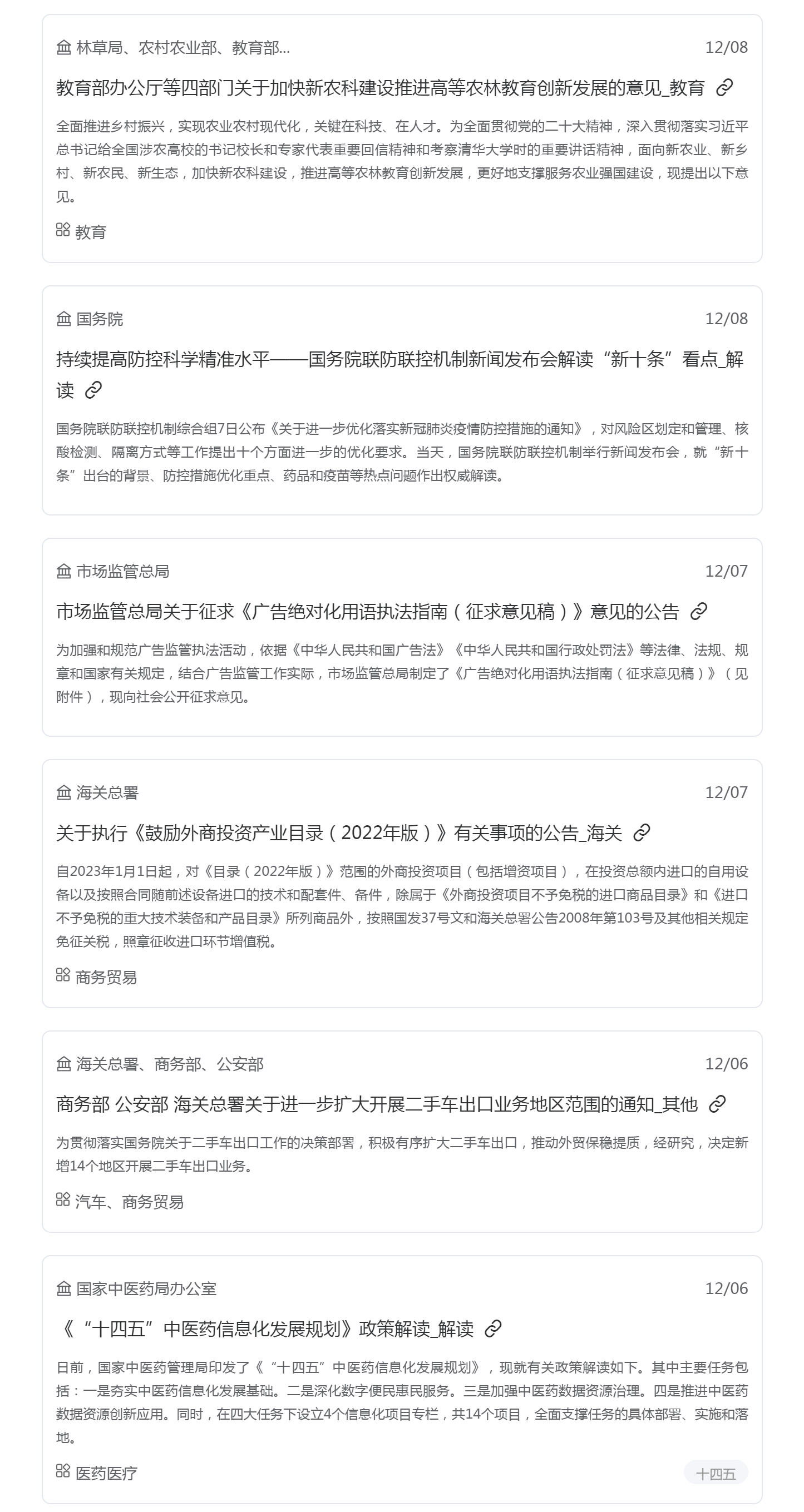 根据梅花数据要政盘点统计,上周共收录重要政策信息共计63条,其中涉及金融、教育以及疫情防控等多个领域,建议重点关注《银行业金融机构国别风险管理办法(征求意见稿)》、《广告绝对化用语执法指南(征求意见稿)》等政策。