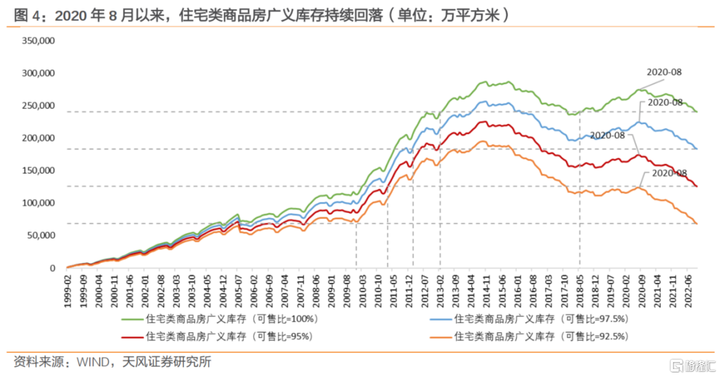 不同的可售比会影响商品房广义库存测算值的高低,但不会显著改变库存趋势。自2020年8月以来,商品房市场处于持续去化状态,经历了长达26个月的持续去化以后,当前的广义库存已经位于较低的水平。
