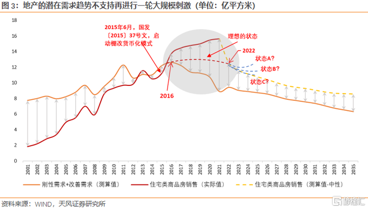 乐观情况下,我们预计今年被拖累的刚性、改善性需求有望逐渐回补,实际销售面积可能向潜在需求中枢收敛。
