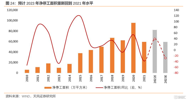 2022年,由于房地产企业风险持续暴露,部分房企开工能力不足,导致净停工面积大幅提升。根据上文对2022年施工面积、竣工面积、新开工面积的预测,2022年的净停工面积约为8.2亿平方米(2021年施工面积-2021年竣工面积+2022年新开工面积-2022年施工面积),较2021年大幅增加2.3亿平方米,增幅高达39%。我们假设在保交楼政策的推进下,2023年净停工面积回到2021年的水平,即5.9亿平方米。