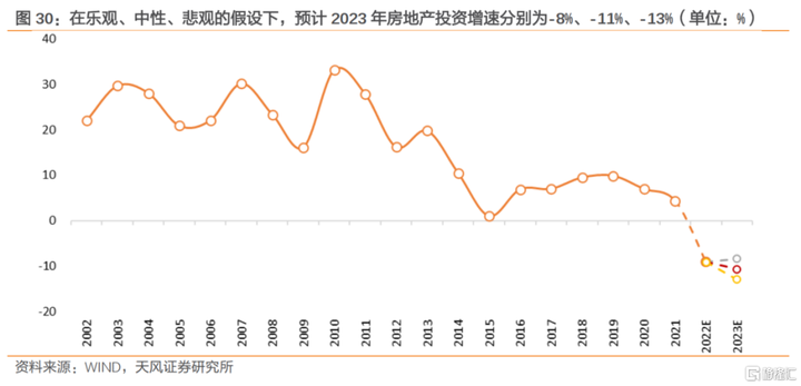 我们预计在乐观、中性、悲观的假设下,2023年房地产投资完成额分别在12.3、12.0、11.7万亿元左右,较2022年下降8%、11%、13%,乐观假设下降幅较2022年收窄0.6pct,中性和悲观假设下降幅扩大1.6、3.9pct。