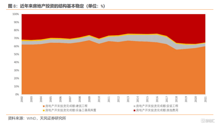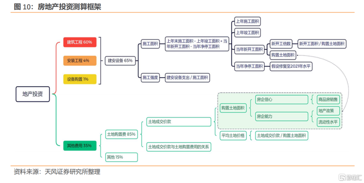 从逻辑上看,预测房地产投资的关键主要在于对房企拿地和开工的判断,分别对应了房地产投资里的建安设备投资和其他费用支出两个部分。从房地产投资的结构来看,近年来各分项的占比基本稳定,建安设备投资(建筑工程、安装工程、设备工器具购置投资)占比65%左右,其他费用占比35%左右(其中土地购置费占比85%左右)。