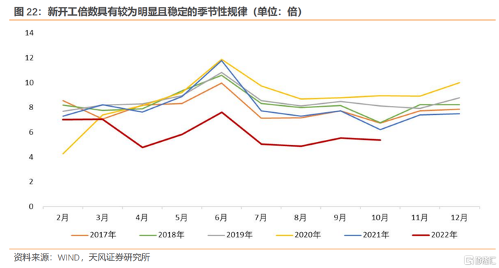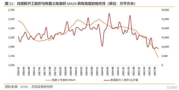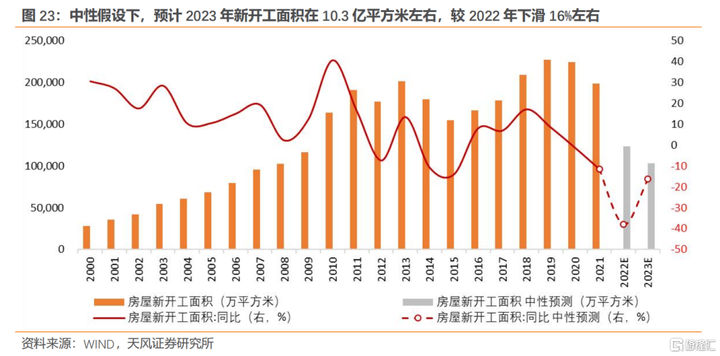 2023年的新开工面积与开工之前24个月的购置土地面积有高度的相关性,用“购置土地面积MA24 / 新开工面积”构建的“新开工倍数”具备较为稳定的季节性规律。利用月度购置土地面积数据,可预测在乐观、中性、悲观的假设下,2023年新开工面积分别为10.5、10.3、10.1亿方左右,较2022年预计分别下降-15%、-16%、-18%。