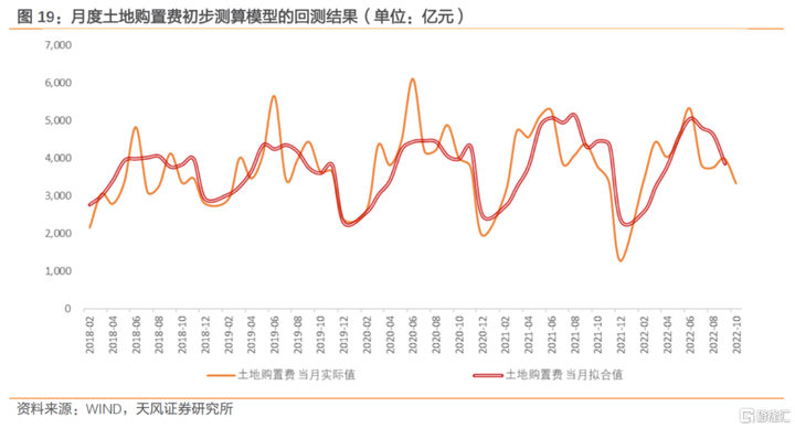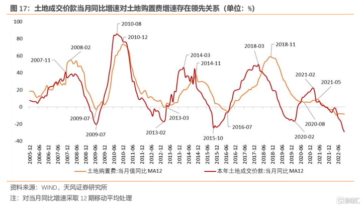 从历史数据来看,土地成交价款当月同比增速拐点对土地购置费当月同比增速存在2-3个季度的领先,并且土地购置费增速具有明显的向下韧性——历史上即使土地成交价款大幅下滑,但同期土地购置费很少出现过深度的下跌(图17)。过去土地购置费增速之所以具备向下韧性,是因为我国房地产市场从未发生过土地成交价款连续两年下滑的情况,在分期付款的模式下,不同时期拿地的首付款、尾款会形成对冲效应——以2022年为例,今年土地购置费因为有去年土地尾款的支撑,实际的下跌幅度并不大。但是2023年房企的拿地能力和信心大概率仍然偏弱,明年的土地首付款和尾款可能会同时偏低,加上2022年的基数效应拖累,这意味着2023年土地购置费将出现历史上的首次深度下跌。