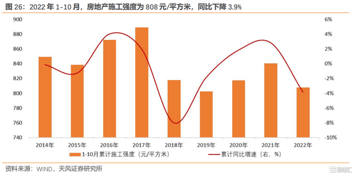 2022年,房地产施工强度弱于往年。2022年1-10月,施工强度约为808元/平方米,处于2014年以来偏低的水平,仅高于2019年,较2021年同比回落3.9%。施工强度的下降,可能与房地产风险暴露过程中大量停工以及周转放缓有直接关系。