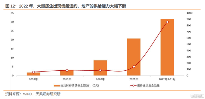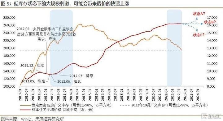 低库存意味着供给刚性,价格会对需求的增加变得更加敏感,大规模刺激可能带来房价的快速上涨。2012年,房地产销售在低库存的情况下快速回暖,进而带来了房价的上涨。而当前的广义库存水平同样较低,同时大量民营房企已经出险、2022年拿地面积较少,房企补库能力还有待修复,供给端弹性相对不足。在这种情况下,对需求侧进行大规模刺激,商品房有效供给不足的问题可能会加速暴露,从而导致房价再次出现明显的上涨压力。