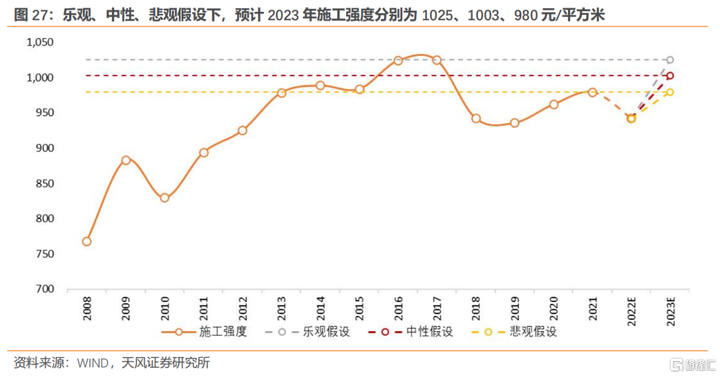 2023年施工强度有望提升,“保交楼”的加速推进将直接带动房企加大对在建项目的投入力度。乐观情景下,我们预计2023年施工强度有望提升至近年来高点——2017年的1025元/平方米;悲观情景下,预计2023年施工强度大概率至少能够与2021年的980元/平方米持平;中性情景取乐观、悲观情景下施工强度的均值,即1003元/平方米。
