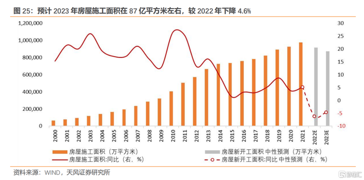 2023年施工面积预计在87亿平方米左右,较2022年下降4.6%,同比降幅有望收窄1.5pct。