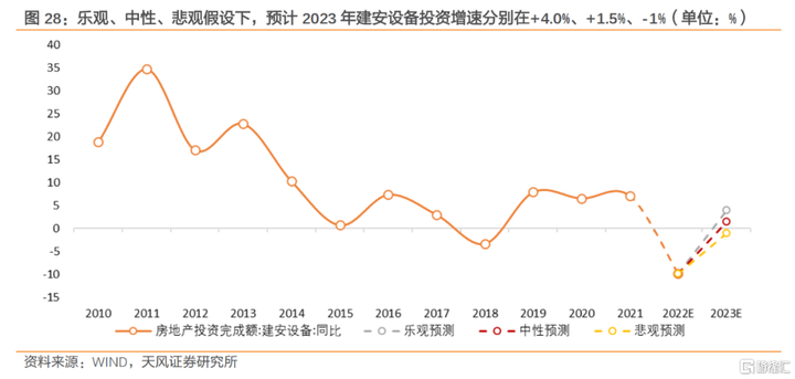 综合对2023年施工面积、施工强度的假设和预测,可以得到对2023年房地产投资中建安设备投资的预测。结果显示,在乐观、中性、悲观的假设下,2023年建安设备投资预计分别在8.97、8.75、8.53万亿元左右,同比增速为+4.0%、+1.5%、-1.0%。