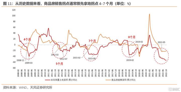 土地购置费是房地产开发企业通过各种方式取得土地使用权而实际支付的费用,从根本上取决于房企拿地。从历史数据来看,商品房销售与房企拿地存在相关性,商品房销售增速的拐点多数情况下领先购置土地面积增速拐点4-7个月。而本轮除需求侧因素外,还存在大量民营房企违约、预售资金面临严监管、房地产融资链条收紧等供给侧因素。因此拿地滞后于销售的时间大概率比历史周期更长。