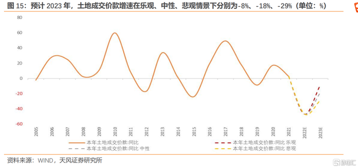 假设2023年土地平均购置价格持平于2022年,乐观、中性、悲观情景下,2023年土地成交价款增速预计分别为-8%、-18%、-29%。