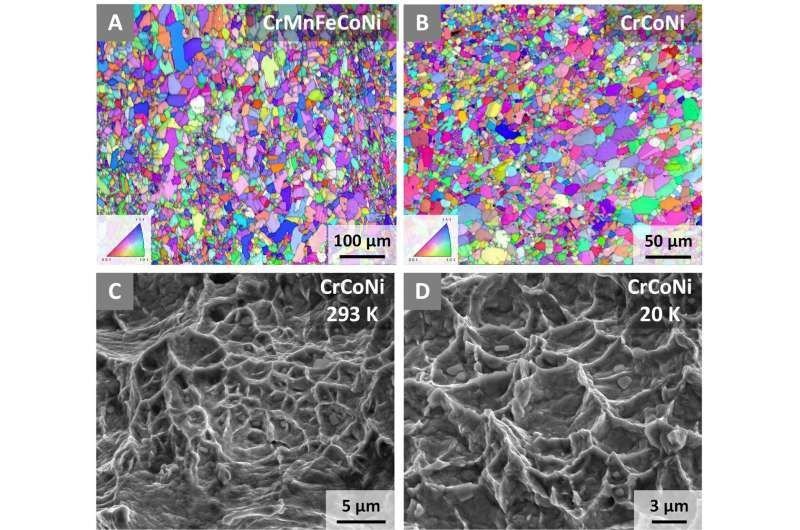 CrMnFeCoNi和CrCoNi在室温(296开尔文、22.85摄氏度)和20开尔文下的扫描电子显微镜图谱。劳伦斯伯克利国家实验室供图