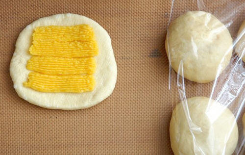 11.松弛好的绵软擀成圆形,挤入黄油杏仁糊,包紧