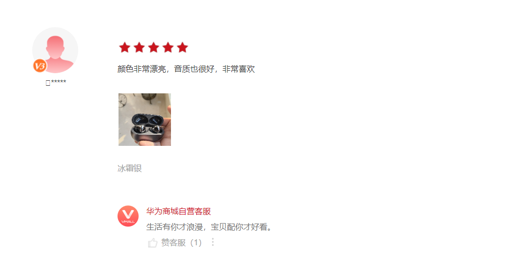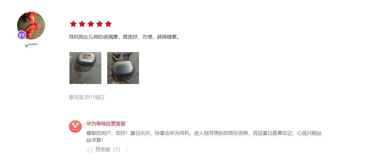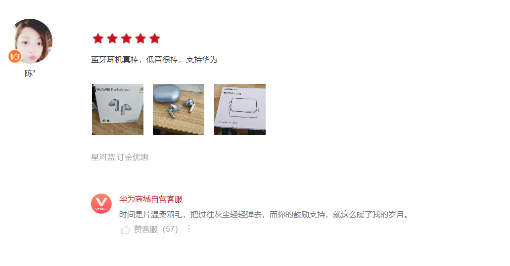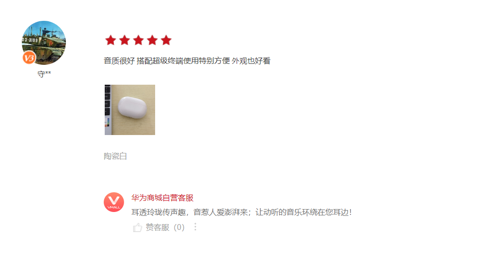一位用户表示:蓝牙耳机真棒,低音很棒,支持华为。