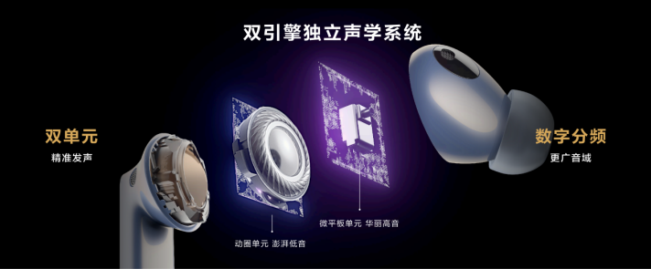 我们知道,耳机作为一项音频设备,其音质表现一定是放在首位的。相比前代,华为FreeBuds Pro 2从发声单元到算法调教实现了全链路的音质升级。在声学器件上,华为FreeBuds Pro 2采用两个独立发声单元的声学架构,其中11mm大动圈单元采用四重磁体双磁路系统负责低音部分,因其磁通量更大,推动振膜的驱动力也会更大,驱动力较上一代提升了30%。高音部分则采用了高端头戴耳机使用的微平板高音单元,配合高音单元的独立出音管道,可以听清音乐中一起一落的丰富细节。配合数字双分频技术,将音乐信号传输到两条独立的处理路径,让动圈单元和微平板高音单元独立工作互不干扰,在各自擅长的频率范围默契配合。