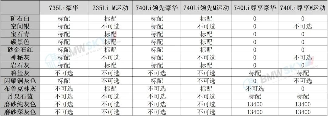 先来说车漆方面,种类比较多,各车型可选类别也不同,大家参考上图即可,还有一点需要说的是双色车漆只有740Li尊享型可以选装,价格为92200元。