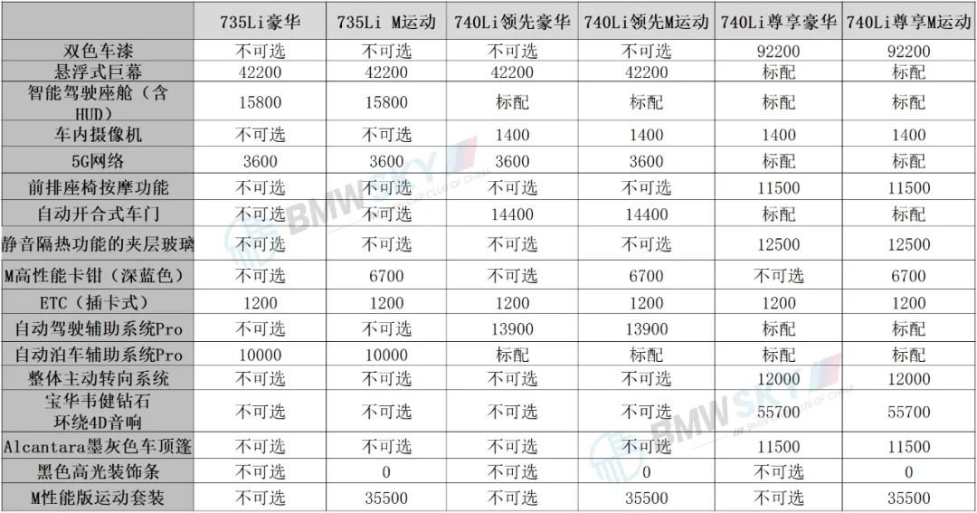 740Li尊享可选双色车身,包括岩石灰/砂金石红、岩石灰/丹泉石蓝、岩石灰/碧玺灰、岩石灰/宝石青以及宝石青/砂金石红、宝石青/丹泉石蓝、宝石青/碧玺会、宝石青/岩石灰。M性能版运动套装包括:M后扰流板、个性化定制黑色高光外观组件、M高性能卡钳(黑色高光)。其他可选配置,各位参照上图表自行决定需不需要吧。