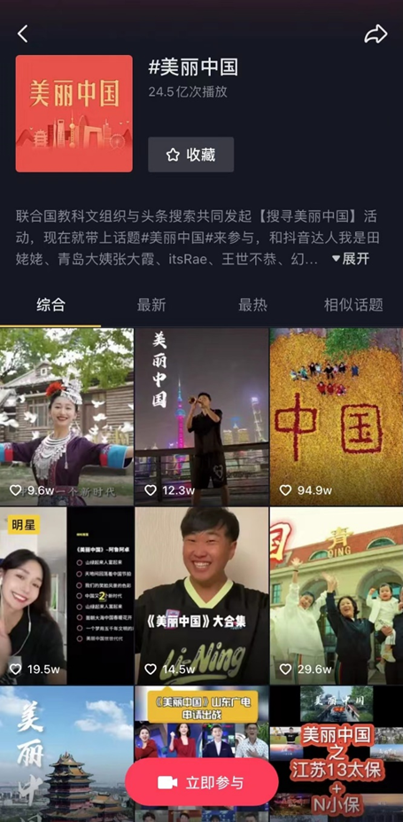 2014年《美丽中国》获得了中宣部“中国梦”主题文艺作品征集二等奖。而在今年,这首歌又再次成为热点,一直在抖音热门榜单上名列前茅,点赞量高达24亿+。