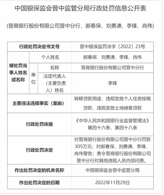 近期,晋中银保监分局一则罚单显示,晋商银行晋中分行因涉及转移贷款用途、违规发放个人住房按揭贷款、违规发放土地储备贷款等三项违法违规事实被罚305万元,对郝春保、刘勇谦、李锋、肖伟4名相关责任人给予警告,责令晋商银行晋中分行对其他违规人员内部问责。