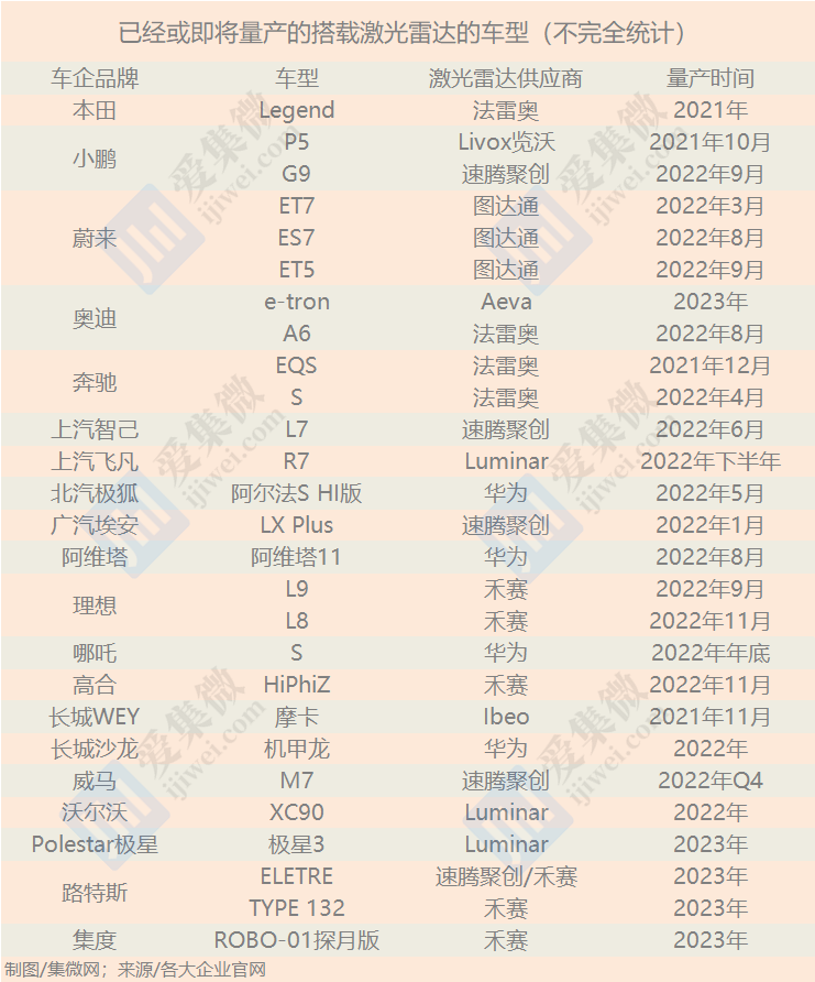 据集微咨询(JW Insights)统计,目前国内市场有超过30款车型已搭载或计划搭载激光雷达,其中有近20 款车型于2022年下半年交付上市。具体车型包括蔚来ET5/ET7、小鹏P5/G9、威马M7、哪吒S、高合HiPhi Z、长城沙龙机甲龙、长城摩卡、埃安LX plus、智己L7、飞凡汽车R7、北汽极狐阿尔法S华为HI版、阿维塔11等。