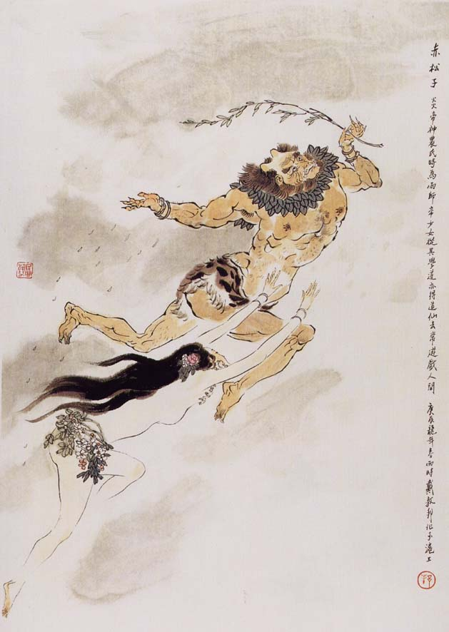 在道教的神仙信仰体系中,赤松子是一位有着相当高神阶的上古大仙。书中记载,赤松子是神农时期的雨师,具有“随风雨而上下”的神通。《淮南子·齐俗》中写道:“(赤松子)吹呕呼吸,吐故纳新,遗形去智,抱素反真,以游玄眇,上通云天。”